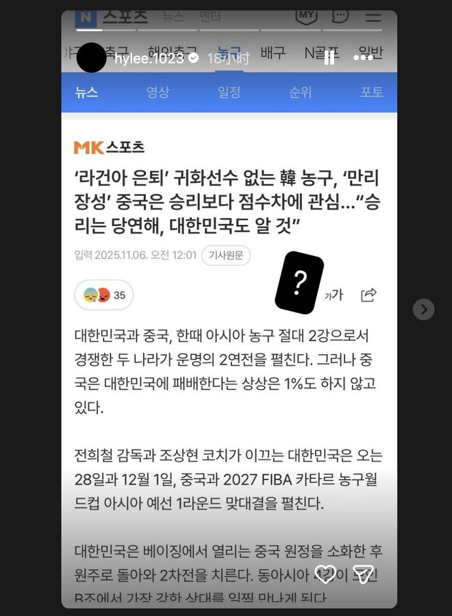 两场世预赛结束后,李贤重在社媒上转发了韩国媒体赛前称很难击败中国男篮的新闻,打了一个问号。而此刻的中国男篮,同样适用这个问号。