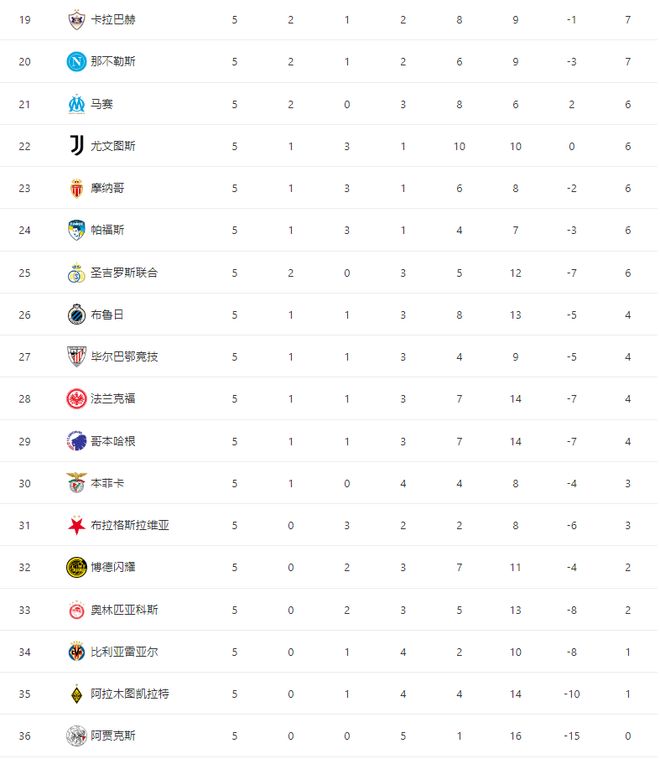 此外,穆里尼奥执教的本菲卡,这一轮击败阿贾克斯之后,终结开局4连败,拿到三分之后升至第30位,保留晋级附加赛的希望,阿贾克斯开局5连败继续垫底,距离被淘汰也是时间问题。