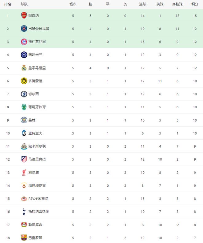 从积分榜来看,阿森纳积15分登上榜首,巴黎升至第二,拜仁、国米分别跌至第三、第四,另外皇马、多特、切尔西、葡萄牙体育同时跻身前八名。